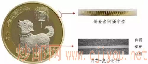 2018年贺岁双色铜合金纪念币集成应用了双金属结构、隐形图文、斜全齿间隔半齿和复合材料四项防伪技术。
