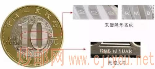 隐形图文。纪念币正面面额数字“10”的轮廓线内,倾斜一定角度,可以分别观察到三个“10”、“RMB”两组图文。