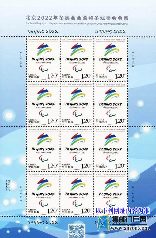 中国邮政定于2017年12月31日发行《北京2022年冬奥会会徽和冬残奥会会徽》纪念邮票1套2枚。详情如下:
