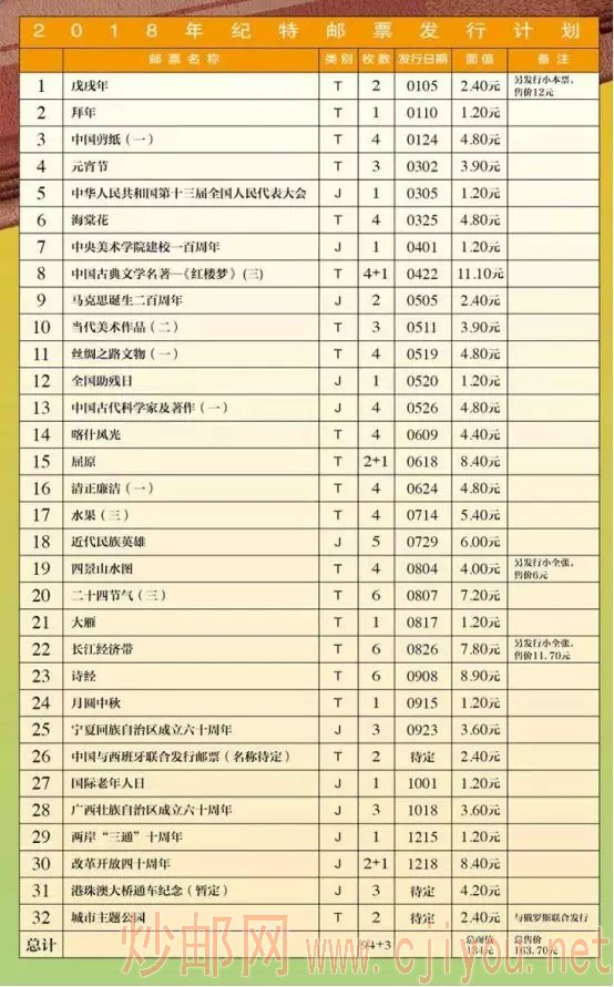 从数量来看,2018年的纪特邮票发行计划共安排了32套新邮,数量上和往年差不多。其中纪念邮票12套,特种邮票20套,总枚数为94+3,另发行小本票1本,小全张2枚。下面让我们通过2018年新邮发行计划表来先睹为快吧!