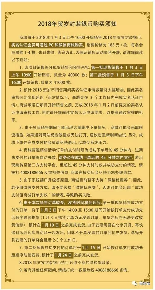 商城于2017年1月5日公开销售2017年贺岁银质纪念币项目,共销售81000枚,每名实名认证会员限购1-3枚。其中上午8点现货销售45000枚,下午14:00预售36000枚,预售订单将于春节后发货。