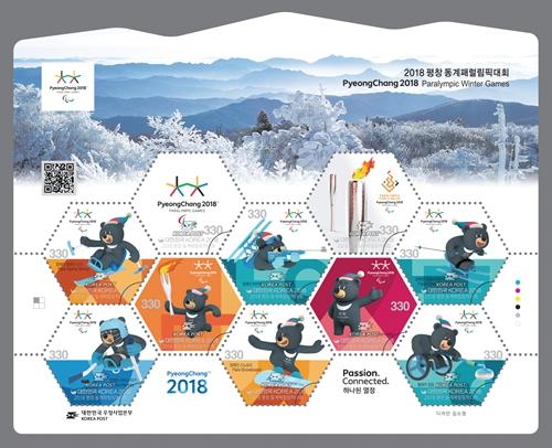 韩国发行的平昌冬季残奥会纪念邮票全套共10枚,图案包括本届残奥会会徽、吉祥物、圣火和全部6个比赛大项。各枚图案依次是:会徽,圣火,残疾人高山滑雪,残疾人冬季两项,残疾人越野滑雪,传递圣火的吉祥物,吉祥物黑熊,残疾人冰球,残疾人单板滑雪,轮椅冰壶。各枚邮票均印有会徽;在表现各比赛项目的邮票中,吉祥物黑熊都以运动员的形象出现。