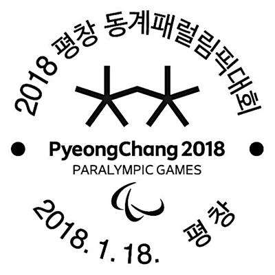 韩国每次新邮发行时,在全国各地主要邮局备有图案统一的纪念邮戳,戳内有地名和每日更换的日期字钉,在使用期间内可自由加盖。本套邮票的纪念邮戳图案是冬季残奥会会徽,使用时间为1月18日至29日。