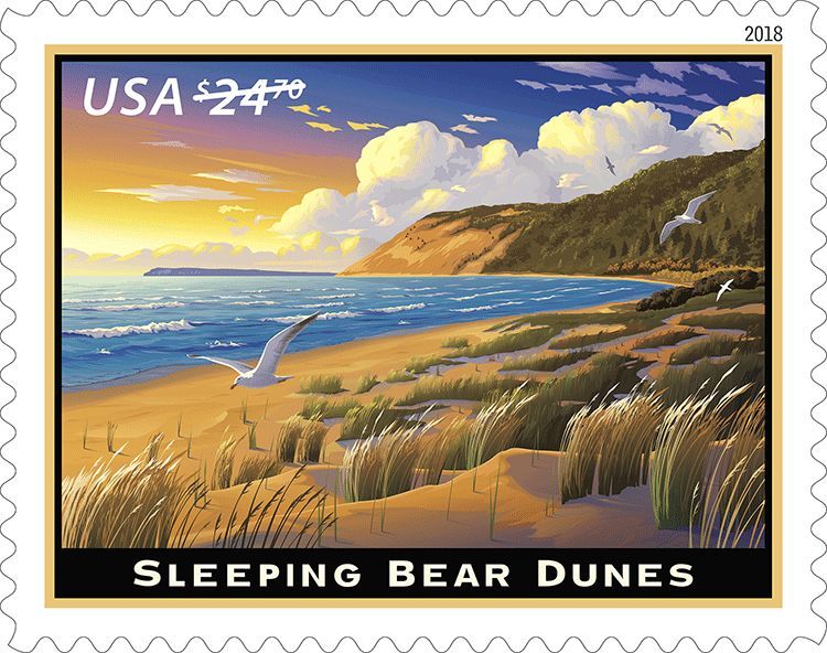2018年1月21日,美国邮政发行一枚优先快件邮资普通邮票,主题为睡熊沙丘。位于密歇根州的睡熊沙丘包括60公里长绵延于密歇根湖东部的海岸线,以及南北曼尼托岛。这里从1972年开始设立为国家公园。