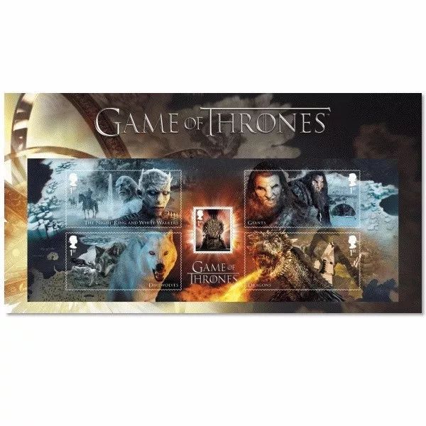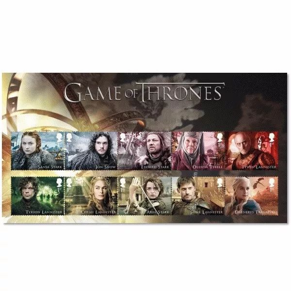 2018年1月23日,英国邮政发行2018年第一套邮票,主题为美国HBO热门电视连续剧《权利的游戏》。这套邮票包括10枚邮票和一枚包含5枚邮票的小型张。《权利的游戏》(Game of Thrones)是美国HBO电视网制作推出的一部中世纪史诗奇幻题材的电视剧。该剧改编自美国作家乔治•R•R•马丁的奇幻小说《冰与火之歌》系列,2015年9月,在第67届艾美奖中,《权力的游戏》破纪录斩获12项大奖,包揽了最佳剧情、导演、编剧、男配等大奖。英国邮政发行这套邮票是因为英国为此系列电视剧的拍摄做出了“很大贡献”,其中北爱尔兰和苏格兰是外景地,而且主要演员都是英国人和爱尔兰人。