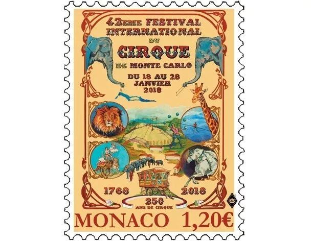2018年1月18日,摩洛哥邮政发行一枚邮票,庆贺第42届蒙特卡洛国际杂技节的召开。蒙特卡洛杂技节是当今规模最大、水平最高的国际杂技艺术节之一。该杂技节于1974年由摩纳哥大公雷尼埃三世创办,最高奖项是“金小丑”奖。此届杂技节也是庆贺近代马戏开创250周年。