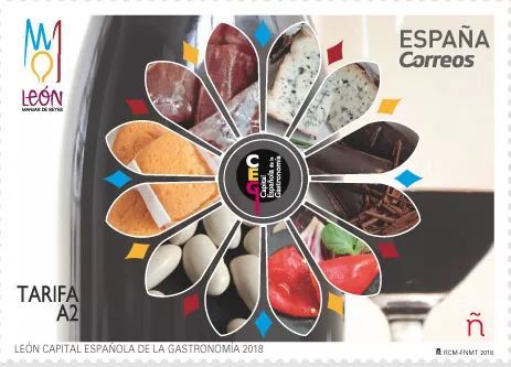 2018年1月17日,西班牙邮政发行一枚《2018年美食之都——莱昂》邮票。莱昂是西班牙西北部卡斯蒂利亚-莱昂自治区莱昂省的首府。这枚邮票上展示了莱昂的牛肉火腿、巧克力等当地的特色美食。