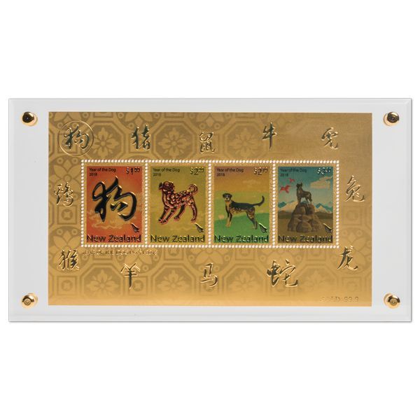 2018年1月18日,为了庆贺中国农历生肖狗年,新西兰邮政按照惯例发行一套4枚邮票和一枚小全张。今年的小全张是金箔版的(24K金),彩色邮票图案上加印金箔。新西兰邮政还推出限量103枚全金箔印制小全张。