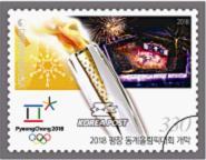 邮票共两枚。第一枚“圣火”。本届冬奥会圣火火种于2017年10月24日采自希腊奥林匹亚,11月1日空运至韩国,在此后的101天里,以“人人闪耀”为主题,冬奥会火炬由7500名火炬手接力,在韩国全国各市、道和冬奥会举办地江原道各市、郡传递,路程总计2018公里,最后在开幕式上进入会场,点燃主火炬。圣火接力的火炬高700毫米,象征着冬奥会举办地平昌的海拔高度700米。火炬的主色调是象征冰雪的白色,白色和火炬外形流丽的曲线又体现了韩国传统白瓷的元素。火炬靠近顶部的金色部分如同火焰,它和火炬下半部都遍布五星图案,五星图案出现在本届冬奥会会徽中,它是韩文中“平昌”的“昌”字首音符号的艺术化。火炬点燃后火焰向五个方向燃烧,象征着世界五大洲。邮票王图为圣火火炬,背景是开幕式场景。
