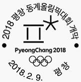 本套邮票的发行纪念邮戳图案为本届冬奥会会徽。韩国的新邮发行纪念邮戳通常使用10天(遇周末顺延),而这枚纪念邮戳的使用时间特别延长,从2月9日直至冬奥会闭幕次日2月26日。