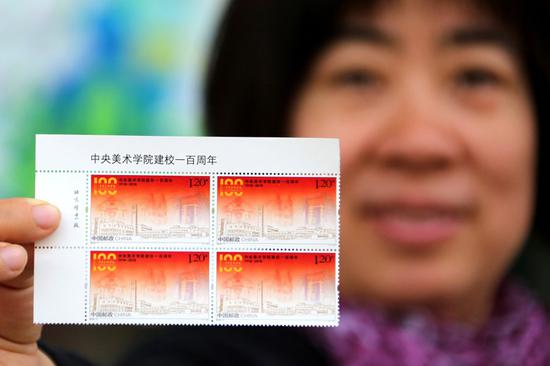 中国邮政发行《中央美术学院建校一百周年》邮票 日期:2018-04-02 4月1日,集邮爱好者在中国邮政集团公司山东枣庄市分公司展示《中央美术学院建校一百周年》纪念邮票。 当日,中国邮政集团公司发行《中央美术学院建校一百周年》纪念邮票一套1枚,邮票面值为1.20元。 新华社发(孙中喆 摄)