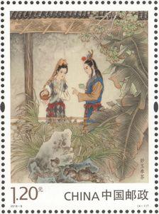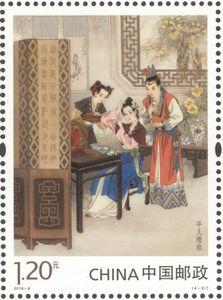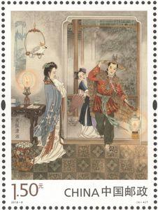 邮票设计采用工笔重彩的创作方法,画面构图饱满,色彩古朴细腻,人物塑造准确生动,栩栩如生,将细致入微的人物心理变化和华丽富贵的故事场景表现得淋漓尽致。