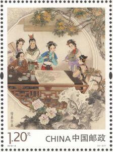 《红楼梦》,原名《石头记》,章回体小说。作品以贾、史、王、薛四大家族为背景,以贾宝玉、林黛玉的爱情悲剧为主线,描写了贾家荣、宁二府由盛转衰的过程。全书内容广泛,涉及各个学科,如诗词歌赋、琴棋书画、亭台楼阁、舟车行轿、服饰妆容、婚丧祭祀、饮食药膳、茶酒文化以及佛教、道教、儒家思想等传统文化,几乎无所不包。全书语言优美生动,善于刻画人物,塑造了许多富有典型性格的艺术形象,具有卓越的艺术成就。第三组四枚邮票分别表现了小说第四十一、四十二、四十四、四十五回中的场景,小型张则表现了第三十七回中的场景。
