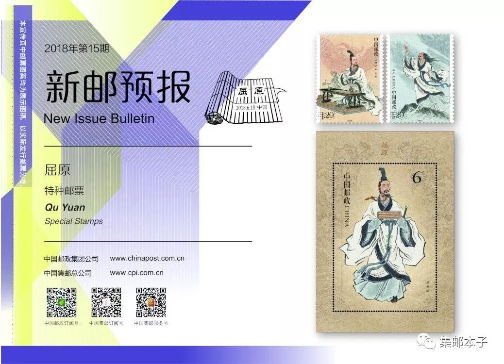中国邮政定于2018年6月18日发行《屈原》特种邮票1套2枚,小型张1枚。详情如下: