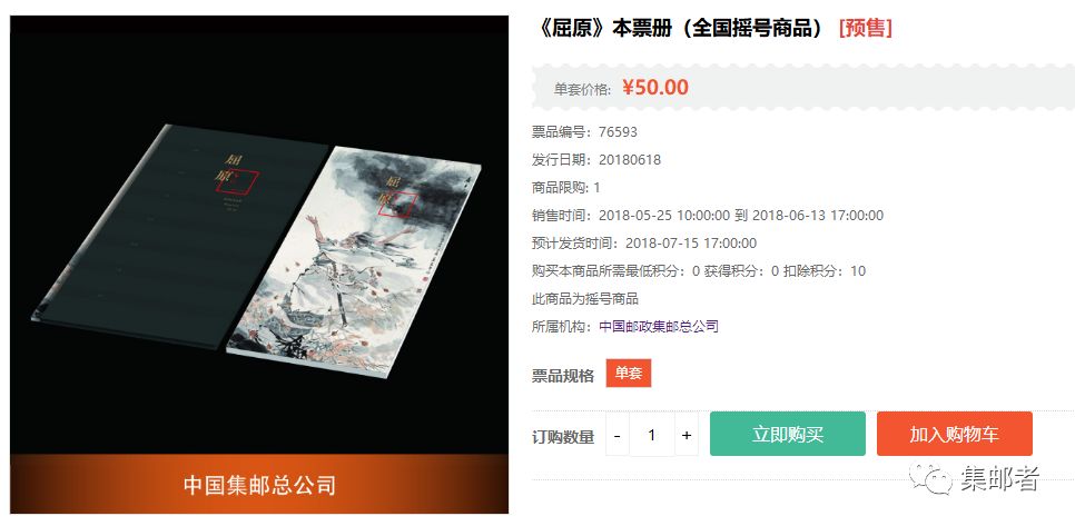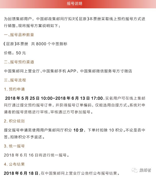 「提醒」屈原本票册及四连体13日截止 日期:2018-06-13 集邮哥 集邮者 屈原本票册及四连体明天摇号截止 目前四连体小型张发行价太高,估计摇号的人特别少,但本票册总体还算不错毕竟可以自提,明天下午5点摇号即将截止,有兴趣的童鞋不要忘记了!