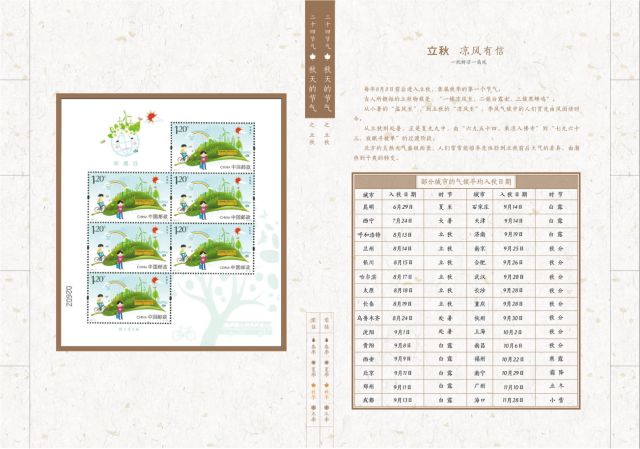 《二十四节气(三)》是节气系列邮票的第三组,表现秋季的六个节气,分别为立秋、处暑、白露、秋分、寒露、霜降,发行日正是“立秋”节气。