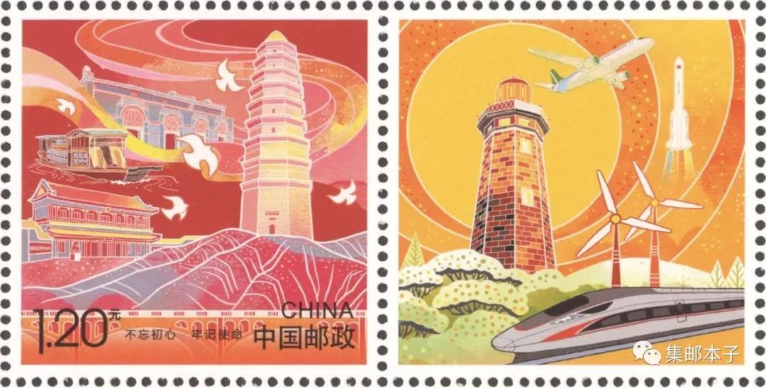个性化邮票主图以上海中共一大会址、嘉兴南湖红船、延安宝塔山、中南海新华门等为主体元素,辅以和平鸽等辅助元素,体现“不忘初心 牢记使命”的主题;附图以高耸的灯塔、飞驰的高铁列车、腾飞的火箭和国产大飞机等为主体元素,象征中国共产党带领中国人民不断把实现中华民族伟大复兴事业推向前进。