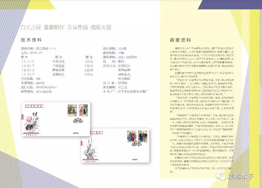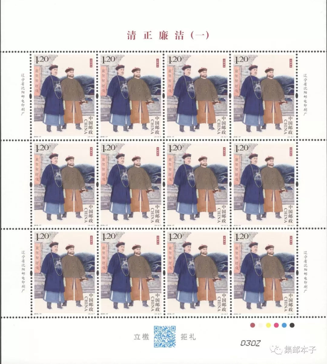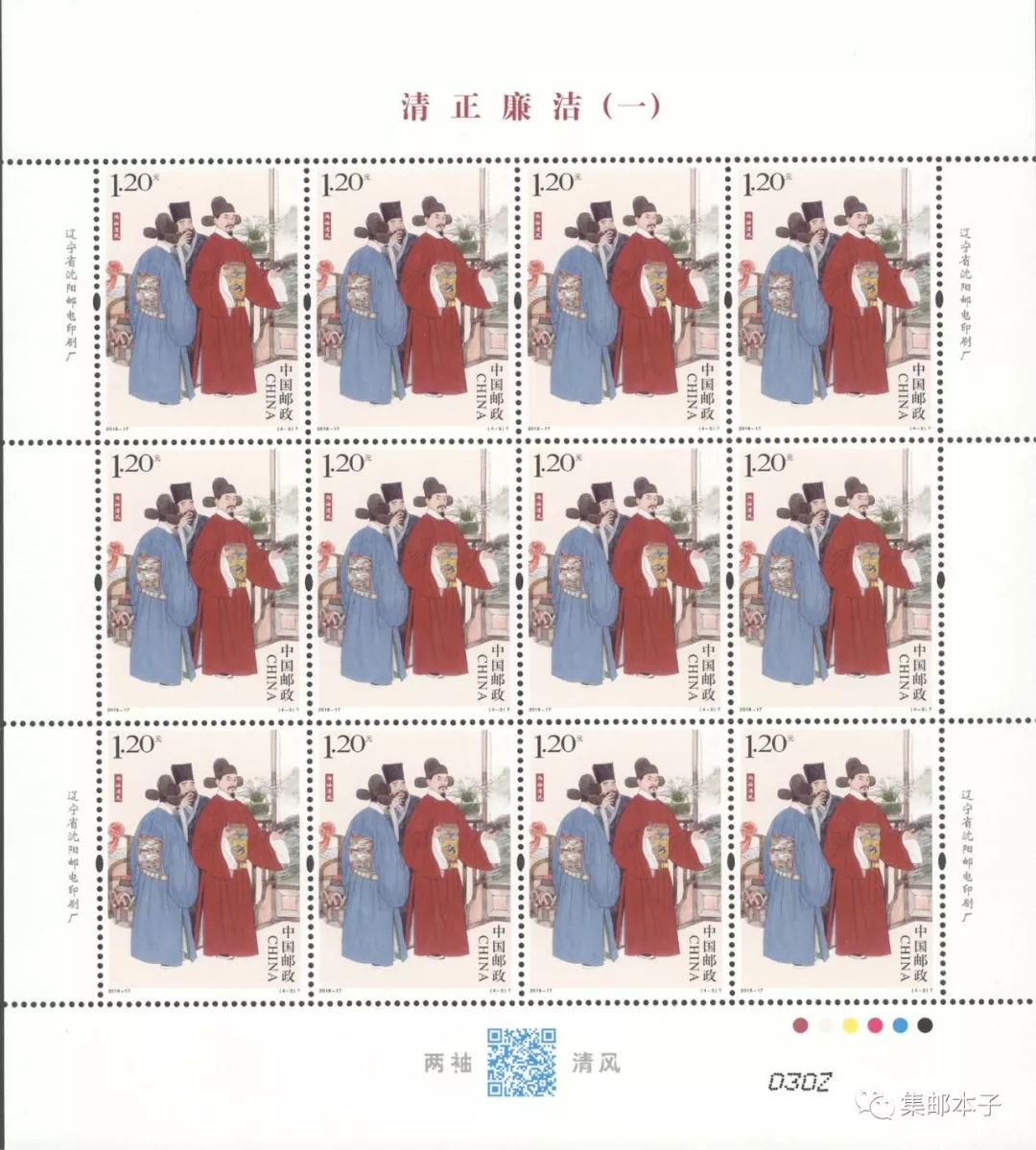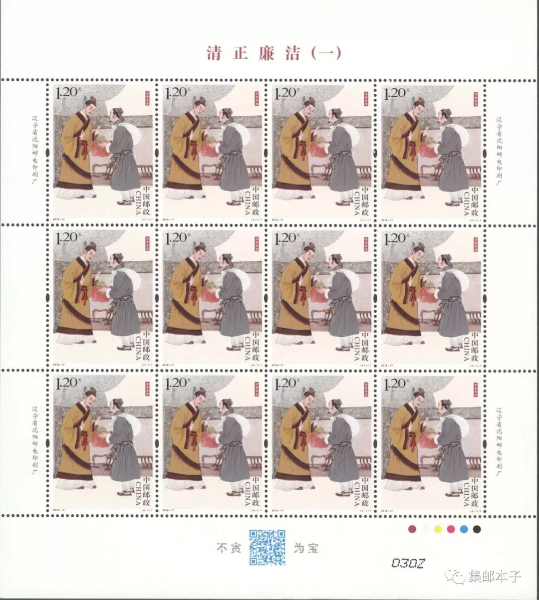 中国邮政定于2018年6月24日发行《清正廉洁(一)》特种邮票1套4枚。详情如下: