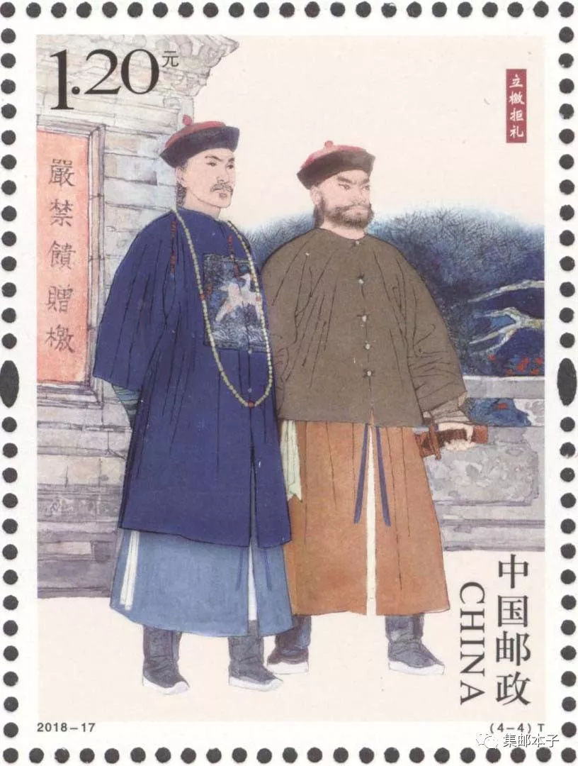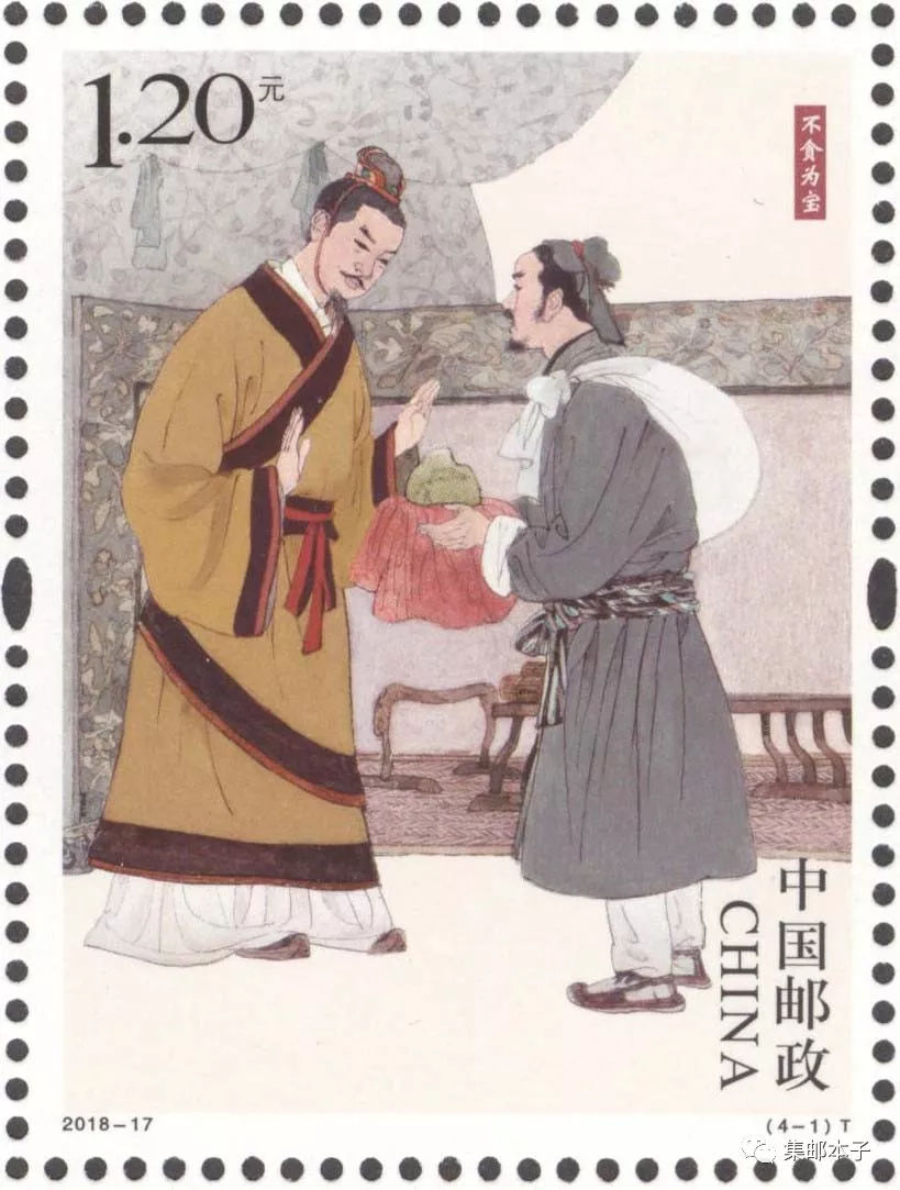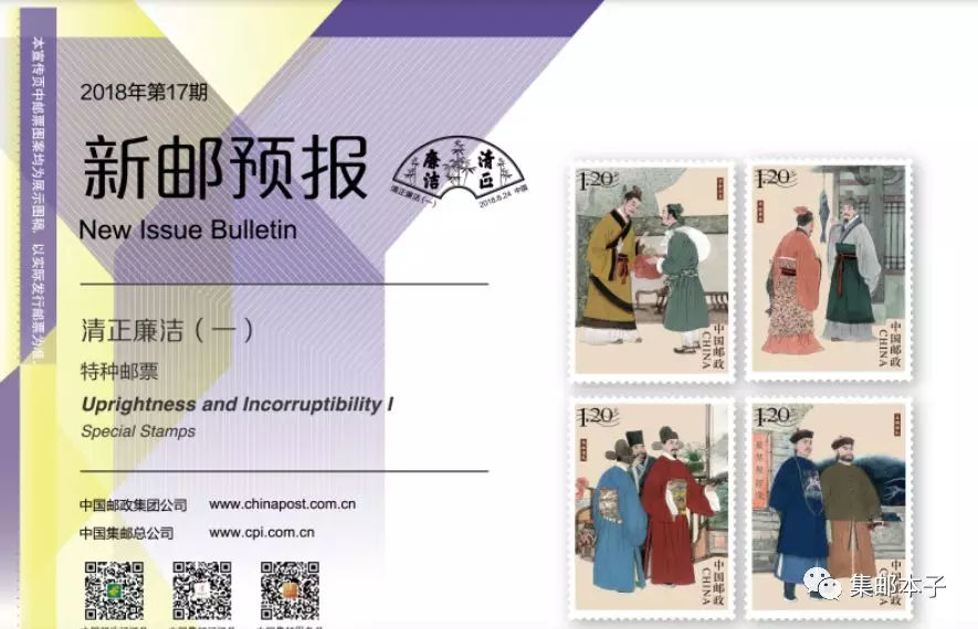 中国邮政定于2018年6月24日发行《清正廉洁(一)》特种邮票1套4枚,邮票图案名称分别为:不贪为宝、羊续悬鱼、两袖清风和立檄拒礼,全套邮票面值为4.80元。