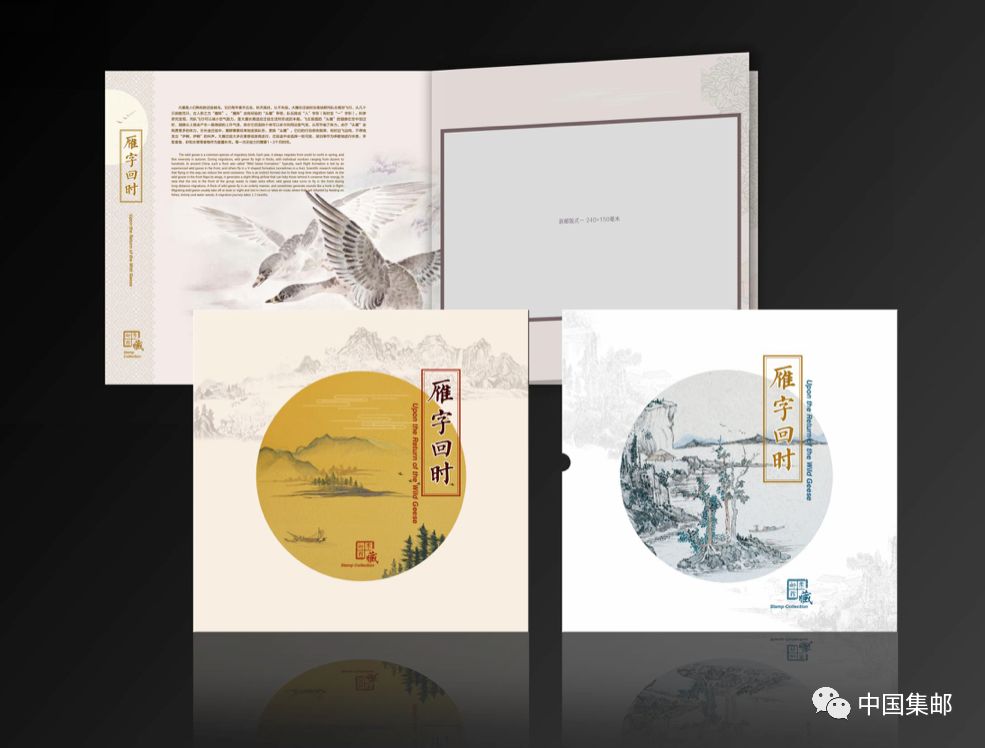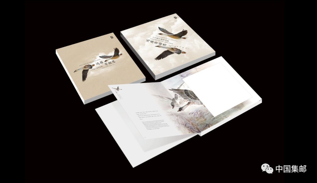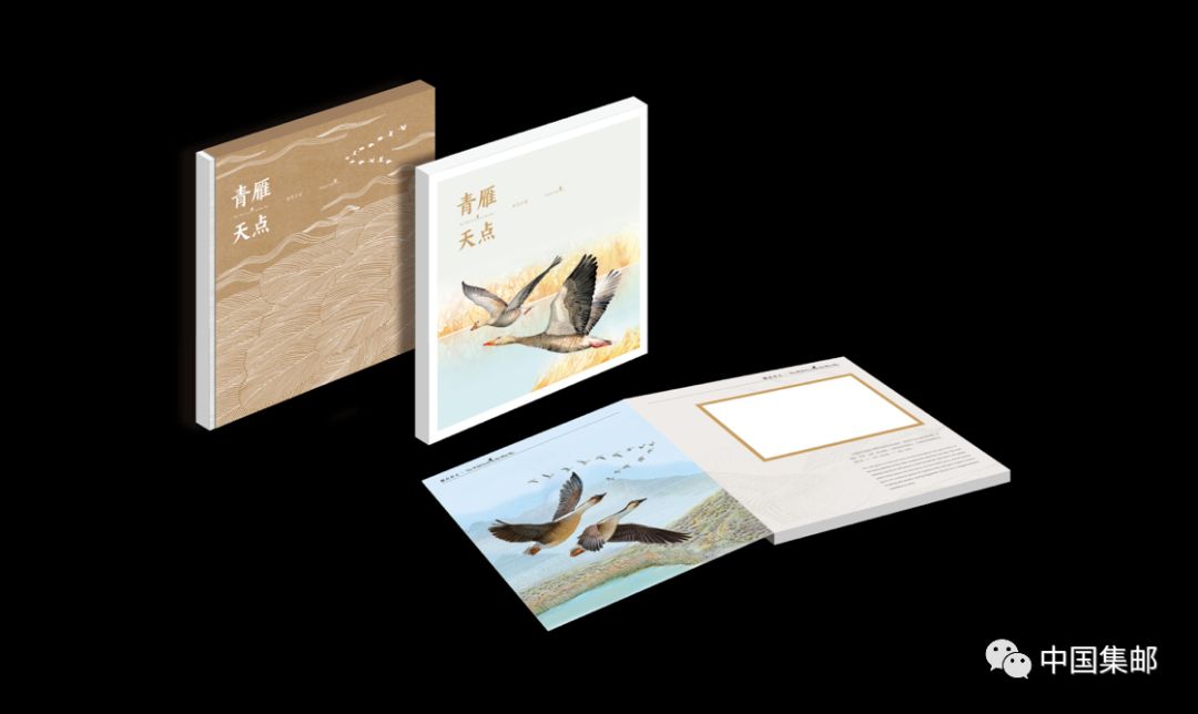 ☆2、邮册设计别致,以大雁雕刻效果诠释其飞翔的的优美姿态。插套选用大雁起飞的动势,封面选用大雁在空中翱翔的动势,不同的姿态充分体现出大雁灵动之感。内页插图选用水彩的表达方式,展现大雁在水间嬉戏的场景。