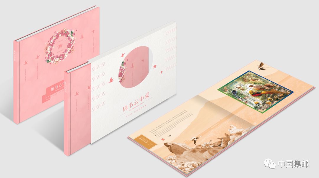 ☆4、设计优美。封面大雁排列出“一”字飞行的特点,运用压凹工艺;邮册通体运用温和的粉色,并配上花环,突出爱情浪漫的特点。