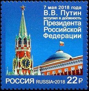 5月7日,俄罗斯邮政以小版张的形式发行《普京宣誓就任总统》正方形纪念邮票1套1枚(见图),以胶版印制,图案为莫斯科克里姆林宫的救世主塔楼与飘扬着总统旗的总统府。小版张内含邮票9枚,边纸印有俄罗斯国旗色的丝带装饰。配发有首日封1枚,封图为总统旗。莫斯科与圣彼得堡(普金出生地,当时称为“列宁格勒”)两地启用了以总统旗与总统徽章项圈为图案的发行首日纪念邮戳。 |