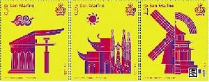6月5日,圣马力诺有5套新邮同时面世。其中与中国主题相关的是一套庆祝2018中欧旅游年的邮票(图1)。3枚邮票均以黄色为底,用红色和蓝色描绘邮票中象征中欧经济文化交流的特殊建筑。圣马力诺邮政在新邮公告中说,黄、红、蓝三色是来自中国国旗和圣马力诺国旗的颜色,突出了跨文化融合的想法。邮票中每一栋在现实生活中不可能出现的建筑,均由中欧文化的各一半建筑组合而成,象征了中欧旅游年的目的——促进跨文化的理解,通过新的旅行体验,促进旅游业的持续发展。邮票上的祥云、红日和彩虹预祝中欧旅游年取得圆满成功。 |