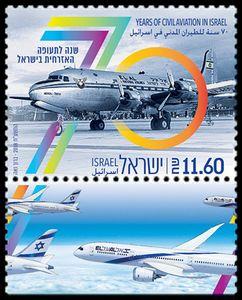 以色列邮政今年4月9日发行邮票,庆祝以色列民航70周年(见图)。在邮票主图的飞机上可以看到公司的标记“ELAL”,意为“朝向天空”。硕大的数字“70”以彩虹色环绕在飞机周围,烘托出热烈的气氛。齿孔下面是以色列邮票独特的边纸附票,展现了多架翱翔在蓝天中的以色列民航班机。