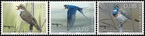 5月19日至21日,第8届国际鸟类邮展(BIRDPEX8)在卢森堡的蒙多夫莱班举办,共有来自卢森堡、德国、比利时、荷兰、瑞士、乌克兰、以色列与印度8个国家的42位集邮者的52部鸟类专题邮集参展。为配合本届邮展的举办,卢森堡邮政于5月15日以小版张的形式发行以“稀有鸟类”为题的邮票1套3枚(见图),图案分别为芦莺、家燕与蓝点颏,票面左下角均印有本届邮展的徽志。 |