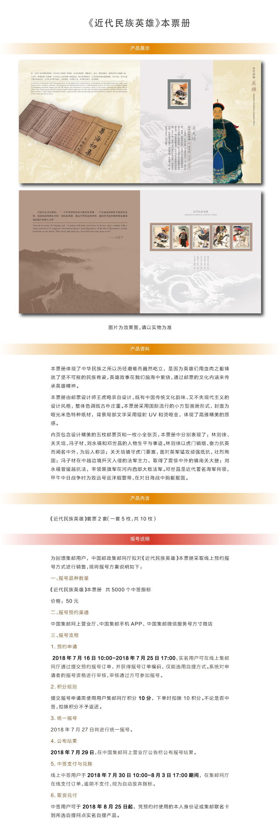 为回馈集邮用户,集邮网厅拟对《近代民族英雄》本票册采取线上预约摇号方式进行销售,现将摇号方案说明如下:
