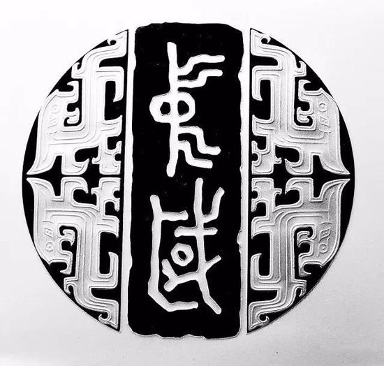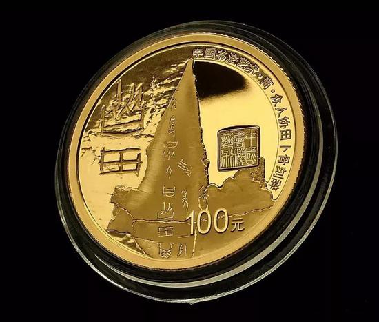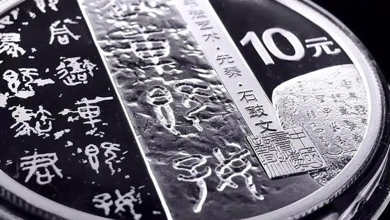 从表现形式上,有提炼出来的具有某种精神象征性的汉字符号,譬如正面的西周金文“中国”,就是西周早期青铜器何尊的底部铭文中提炼出来的,这里的“中国”二字之所以具有精神象征性,因为“中国”二字作为一个词组的最早出现,也因为中央电视台纪录片《国宝档案》的介绍而广为人知,可以说是早期篆书体系中最经典的汉字符号;也有以拓片形式表现的,譬如8克金币是卜骨刻辞整拓片,150克银币是青铜器铭文整拓片,30克银币则是石鼓文、泰山石刻文的局部拓片,除此以外,每枚币面上还有篆刻钤印。兼顾到了篆书在不同环境、不同位置、不同视觉空间上的形质特征,将形式与背景细化成多种组合方式,有解构也有建构,有再现也有创造,提供了篆书艺术的最大表现价值,让我们既可以欣赏到篆书在笔画间关系的变化,也能欣赏篆书在不同表现下的空间形态。这样深度挖掘和表现篆书的形式之美,不但内容上得到了扩展,而且在意蕴上得到了进一步的开掘。