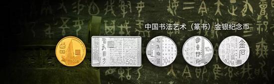 篆书纪念币是书法系列的首套,这套币奠定了整个系列项目的设计格调。这套币共5枚,8克金币1枚,150克长方形银币1枚,30克银币3枚。