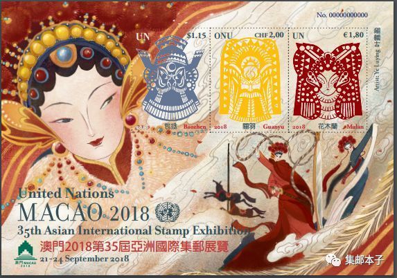 2018年9月21日,联合国邮政管理局将发行内含3枚邮票的特别版小全张以纪念第35届澳门亚洲国际集邮展览。小全张由叶露盈(中国)设计。3枚邮票使用激光镂空,面值分别为美元1.15、瑞士法郎2.00和欧元0.80,印量为18000版,法国卡特安全印刷公司印刷。