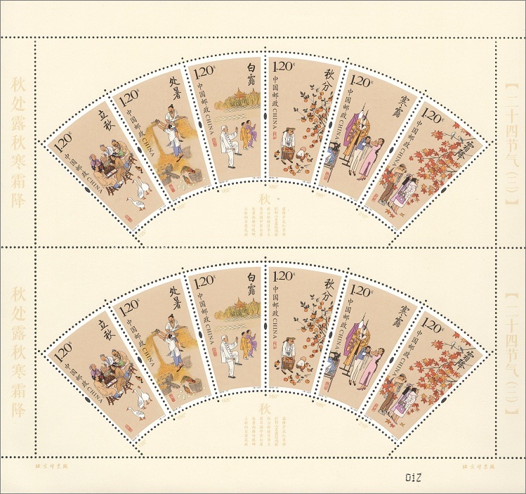 中国邮政定于2018年8月7日发行《二十四节气(三)》特种邮票1套6枚。详情如下: 志号:2018-21 图序 图名 面值 (6-1)T 立秋 1.20元 (6-2)T 处暑 1.20元 (6-3)T 白露 1.20元 (6-4)T 秋分 1.20元 (6-5)T 寒露 1.20元 (6-6)T 霜降 1.20元 邮票规格:上圆弧长30.76毫米,直边长48毫米(扇形) 齿孔度数:13度 整张枚数:12枚(2套,6枚连印)