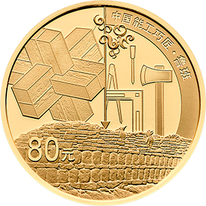5克圆形金质纪念币背面图案为鲁班锁、鲁班堤,配以木工工具装饰图形等组合设计,并刊“中国能工巧匠·鲁班”中文字样及面额。