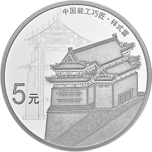 15克圆形银质纪念币背面图案为样式雷作品——北京正阳门箭楼立样及其大木立样组合设计,并刊“中国能工巧匠·样式雷”中文字样及面额。