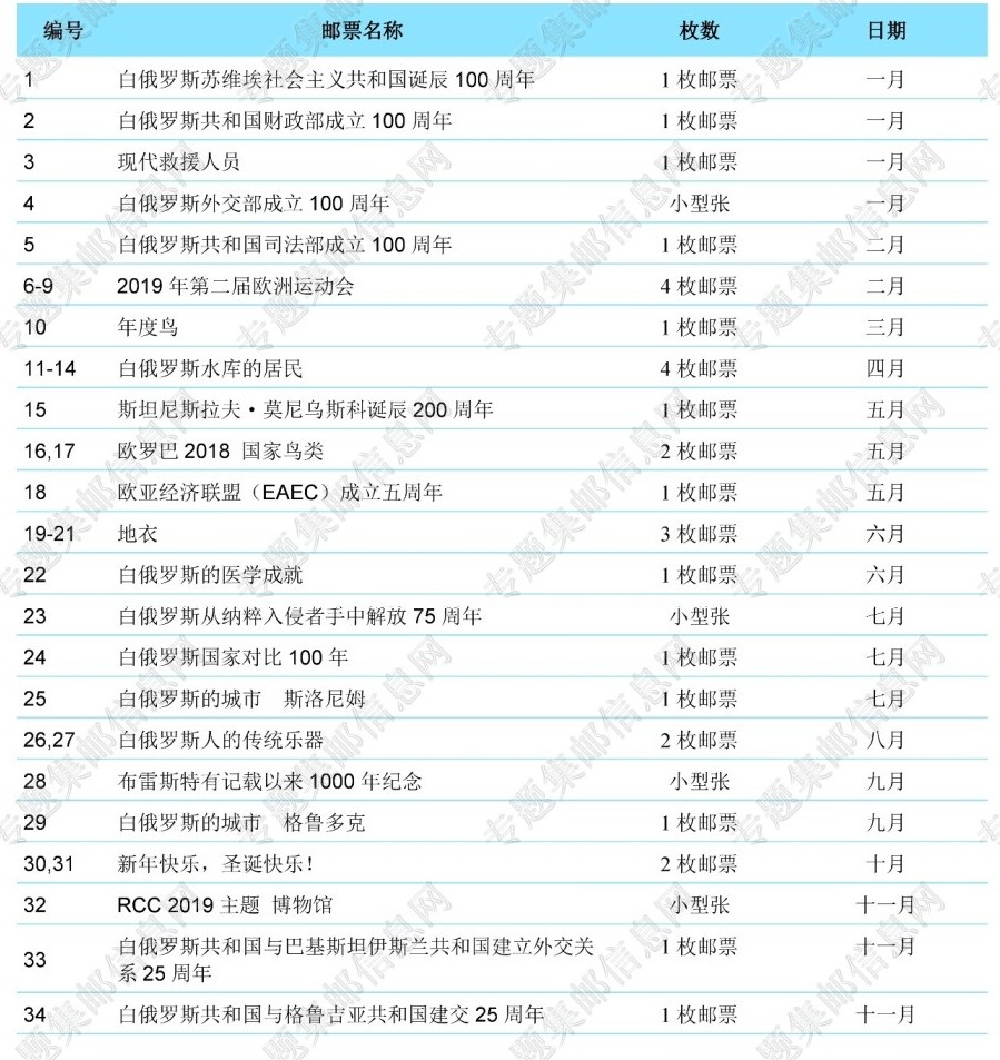 白俄罗斯2019年新邮发行计划【暂定计划】 日期:2018-08-18 2018-8-18 专题集邮信息网编译自白俄罗斯共和国工业和信息化部 内容简要:白俄罗斯2019年新邮发行计划 白俄罗斯2019年邮票发行计划... 2018年6月24日公布版本