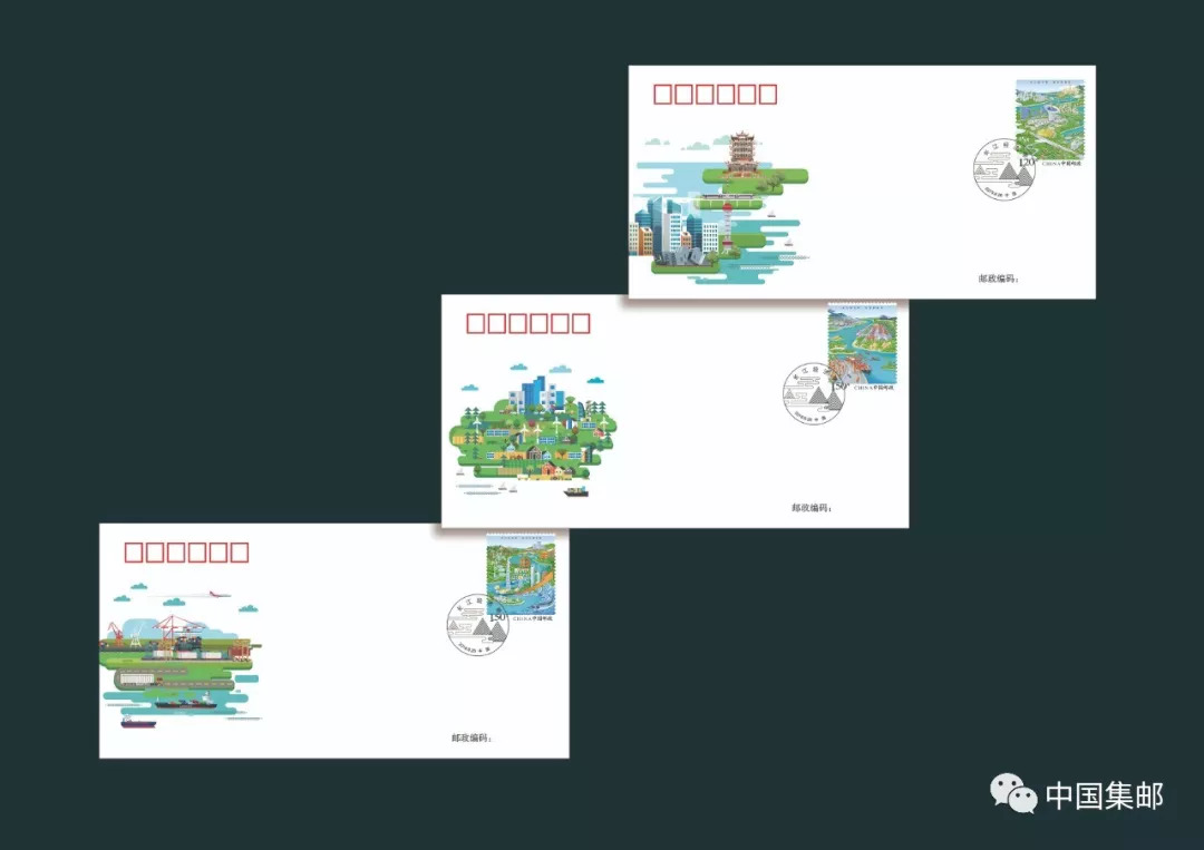 首日封分别用以水系、长江防护林、湿地、山水林田湖、代表性生物构筑的生态文明场景;以长江水路船舶航运为主体、辅以铁路、公路、航空构筑的立体交通;以电子信息产业、汽车自动化装配、智能制造等为代表的新型产业格局场景;以现代建筑群、现代化生活区体现新型城镇化;海岸港口、贸易物流船舶、集装箱、货运车、飞机等内容体系开放新局;以城市地标建筑、互联网信息共享等元素体现区域协同。