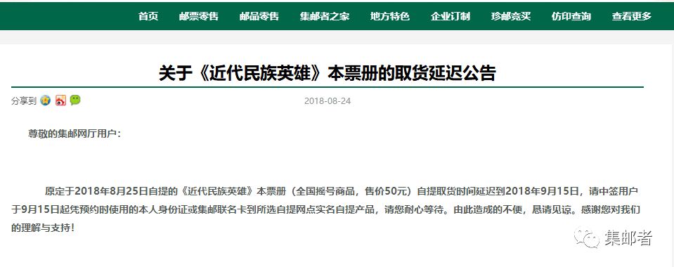 原定于2018年8月25日自提的《近代民族英雄》本票册(全国摇号商品,售价50元)自提取货时间延迟到2018年9月15日,请中签用户于9月15日起凭预约时使用的本人身份证或集邮联名卡到所选自提网点实名自提产品,请您耐心等待。由此造成的不便,恳请见谅。感谢您对我们的理解与支持!
