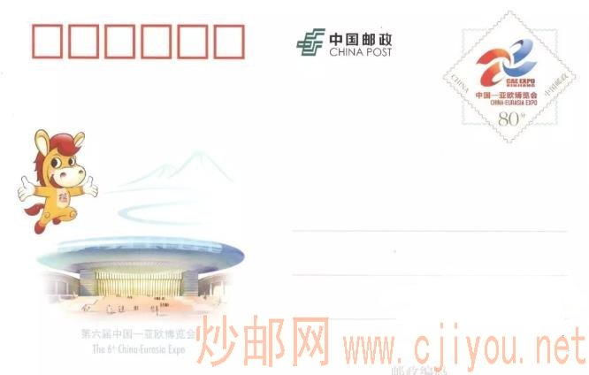 中国邮政定于2018年8月30日发行《第六届中国—亚欧博览会》纪念邮资明信片1套1枚。详情如下:
