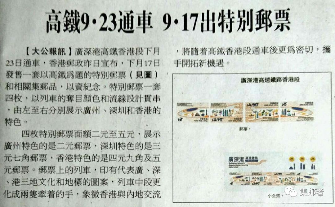 中国香港邮政9月17日为高铁发行特别邮票,为纪念广深港高铁香港段通车: