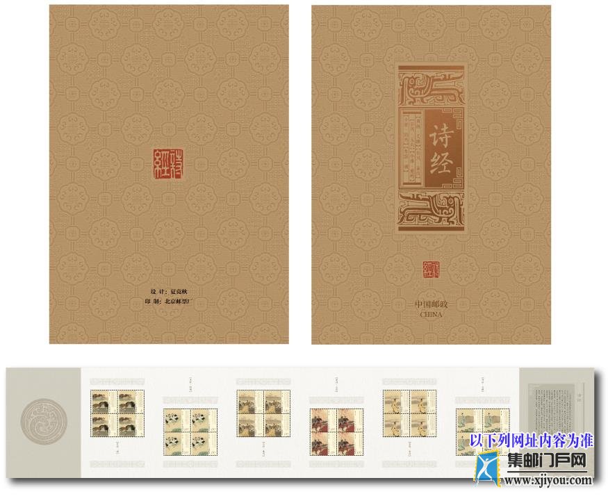 集邮门户网讯 中国邮政制作《诗经》四方连邮票风琴折一套:成品规格115×165毫米,面值35.60元,专用于中国集邮总公司邮品。四方连邮票折设计者:夏竞秋。