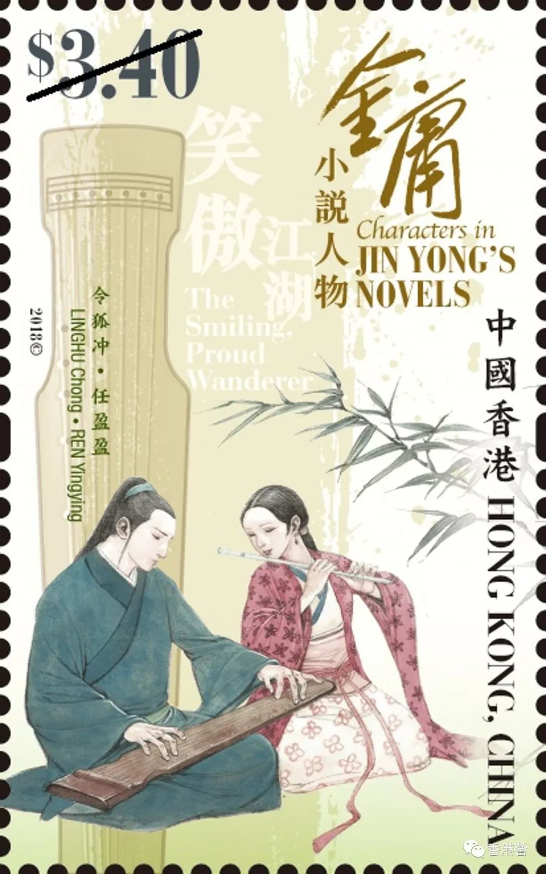 这套特别邮票展示金庸笔下的一些重要小说人物,包括郭靖、黄蓉(射雕英雄传)、陈家洛(书剑恩仇录)、令狐冲、任盈盈(笑傲江湖)、张无忌(倚天屠龙记)、杨过、小龙女(神雕侠侣)、韦小宝、康熙(鹿鼎记)和桥峰、段誉、虚竹(天龙八部)。