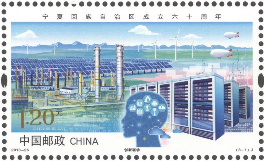 中国邮政定于2018年9月19日发行《宁夏回族自治区成立六十周年》纪念邮票1套3枚,邮票图案名称分别为:创新驱动、脱贫富民、生态立区,邮票全套面值3.60元。