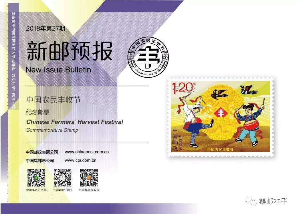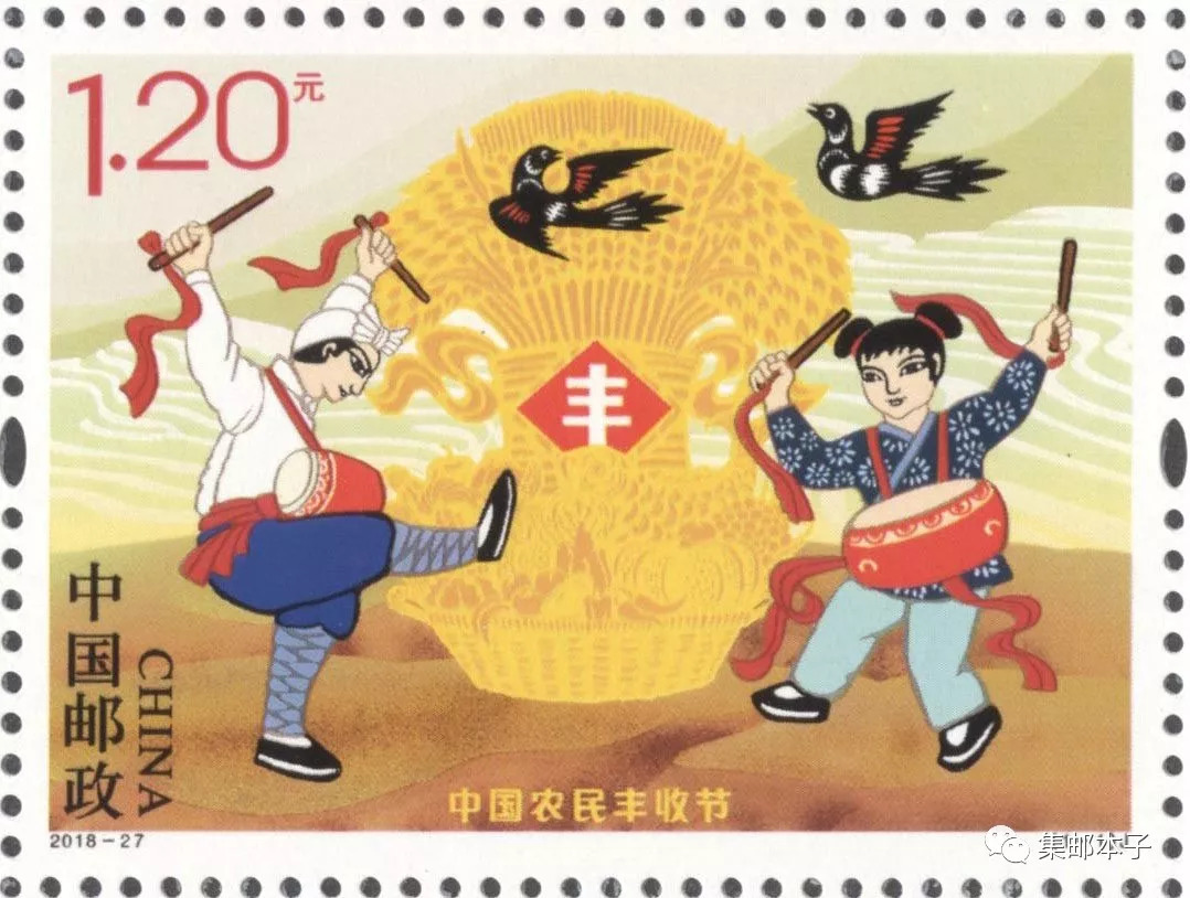 中国邮政定于2018年9月23日发行《中国农民丰收节》纪念邮票1套1枚,邮票面值1.20元。