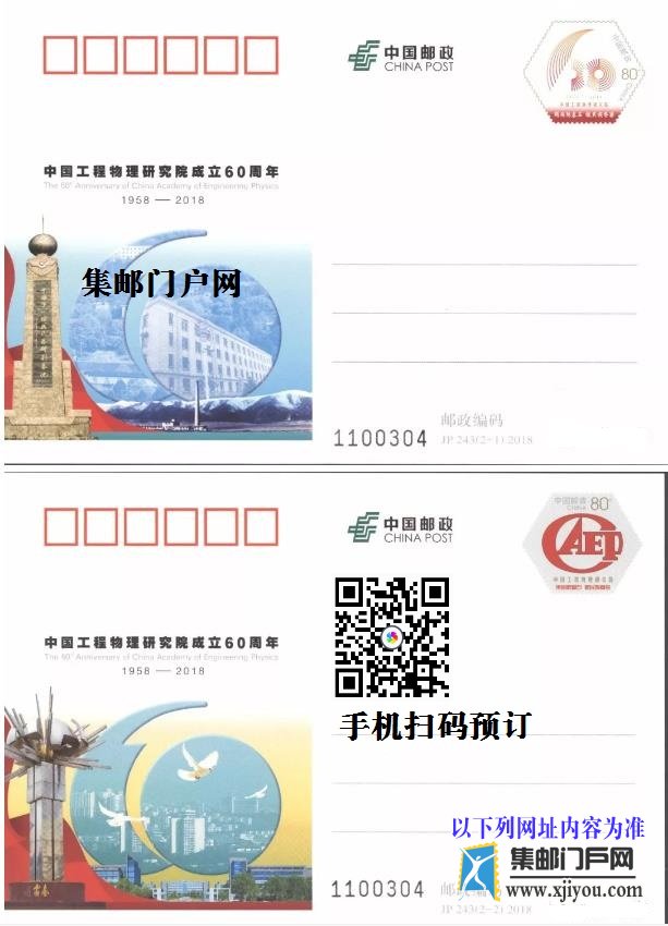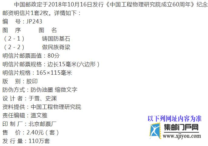 图:JP243《中国工程物理研究院成立60周年》纪念邮资片发行公告 提前到10月16日发行