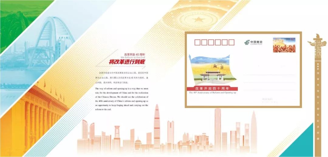 《将改革进行到底》邮票珍藏册,收录了《伟大历程》个性化服务专用邮票整版票,《中国共产党第十九次全国代表大会》套票、小型张,以及《改革开放四十周年》纪念邮资明信片等邮资票品。体现了中国步入改革开放新时代以及习近平主席提出的“改革开放是实现中国梦的必由之路”这一指导思想,是收藏的至臻之选。