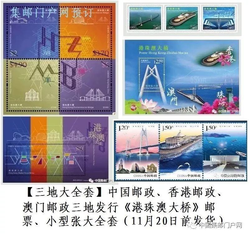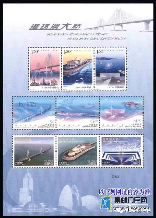 集邮门户网讯 中国邮政公告:中国邮政与香港邮政、澳门邮电共同印制同题材邮票小全张1枚,内含中国邮政、香港邮政、澳门邮电邮票各3枚。集邮门户网讯,小全张整张规格:140×195毫米。小全张设计者:史渊。小全张资料提供:港珠澳大桥管理局、中交公路规划设计院有限公司。小全张邮折发行价:32元。