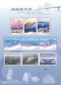 另与香港邮政、澳门邮电共同印制同题材邮票小全张1枚,内含中国邮政、香港邮政、澳门邮电邮票各3枚。小全张整张规格:140×195毫米。小全张设计者:史渊。小全张资料提供:港珠澳大桥管理局、中交公路规划设计院有限公司。小全张邮折售价:32元。