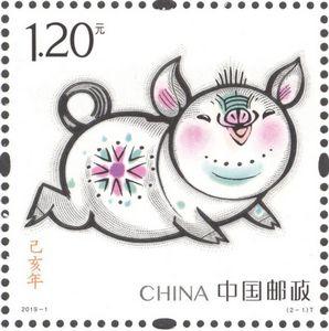 2019年发行的《己亥年》生肖猪年邮票再度邀请第一轮生肖猪的设计者、我国著名艺术大师韩美林担纲设计。韩美林,1936年生于山东济南。工艺美术家,清华大学教授、校学术委员会副主任。曾设计北京奥运会吉祥物福娃。其作品气势磅礴又洞察精微,艺术风格独到而个性特征鲜明。